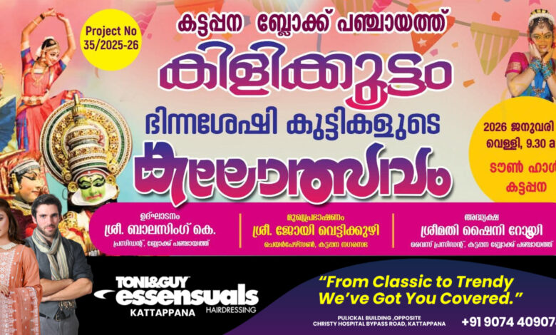 കട്ടപ്പന ബ്ലോക്ക് പഞ്ചായത്ത് ഭിന്നശേഷി കുട്ടികളുടെ കലോത്സവം കിളിക്കൂട്ടം.2026 ജനുവരി 23 ന് 9.30 am ന് കട്ടപ്പന ടൗൺ ഹാളിൽ. ഉദ്ഘാടനം ശ്രീ. ബാലസിംഗ് കെ. പ്രസിഡൻ്റ്, ബ്ലോക്ക് പഞ്ചായത്ത്മുഖ്യപ്രഭാഷണം ശ്രീ. ജോയി വെട്ടിക്കുഴി ചെയർപേഴ്സൺ, കട്ടപ്പന നഗരസഭ അദ്ധ്യക്ഷ :ശ്രീമതി ഷൈനി റോയി വൈസ് പ്രസിഡന്റ്റ്, കട്ടപ്പന ബ്ലോക്ക് പഞ്ചായത്ത്