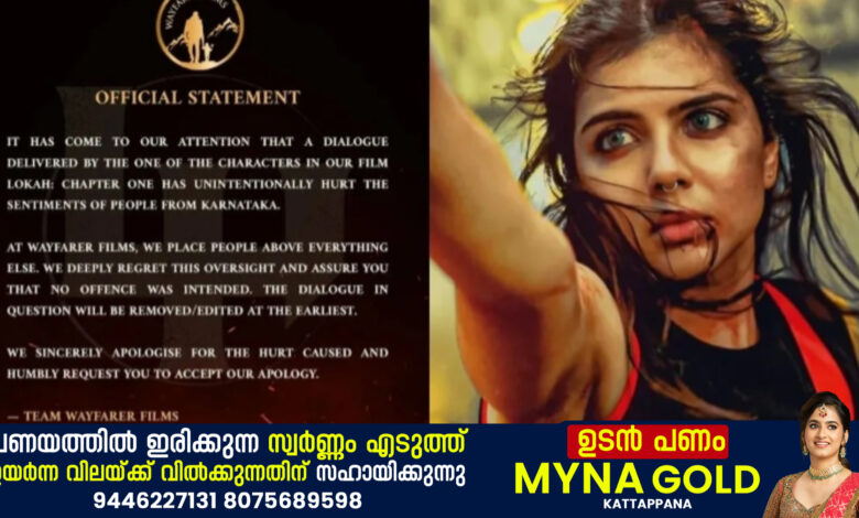 കന്നഡ വികാരത്തെ വ്രണപ്പെടുത്തിയെന്ന ആരോപണത്തിൽ ‘ലോക: ചാപ്റ്റർ വൺ-ചന്ദ്ര’യിലെ ഒരു ഡയലോഗിൽ മാറ്റംവരുത്തുമെന്ന് നിർമാതാക്കൾ. ഡയലോഗ് കന്നഡ വികാരത്തെ വ്രണപ്പെടുത്തണമെന്നുദ്ദേശിച്ച് മനഃപൂർവ്വമുള്ളതായിരുന്നില്ലെന്ന് ദുൽഖർ സൽമാന്റെ ഉടമസ്ഥതയിലുള്ള വേഫെറർ ഫിലിംസ് പ്രസ്തതാവനയിൽ അറിയിച്ചു. സംഭവത്തിൽ ഖേദം പ്രകടിപ്പിക്കുന്നതായും കമ്പനി അറിയിച്ചു.’ഞങ്ങളുടെ ലോക: ചാപ്റ്റർ വൺ- ചന്ദ്ര എന്ന ചിത്രത്തിലെ ഒരു കഥാപാത്രത്തിന്റെ സംഭാഷണം കർണാടകയിലെ ജനങ്ങളുടെ വികാരത്തെ അവിചാരിതമായി വ്രണപ്പെടുത്തിയതായി ഞങ്ങളുടെ ശ്രദ്ധയിൽപ്പെട്ടു. മറ്റെല്ലാത്തിനുമുപരി, മനുഷ്യർക്കാണ് വേഫെറർ ഫിലിംസ് സ്ഥാനം നൽകുന്നത്. ഞങ്ങൾക്കുണ്ടായ വീഴ്ചയിൽ അഗാധമായി ഖേദിക്കുന്നു. ഇതിലൂടെ ഞങ്ങൾ ആരേയും വേദനിപ്പിക്കാൻ ഉദ്ദേശിച്ചിട്ടില്ലെന്ന് വ്യക്തമാക്കുന്നു. പ്രസ്ത സംഭാഷണം എത്രയും വേഗം നീക്കംചെയ്യുകയോ എഡിറ്റ് ചെയ്യുകയോ ചെയ്യുന്നതായിരിക്കും. ഇതുമൂലമുണ്ടായ വിഷമത്തിന് ഞങ്ങൾ ആത്മാർഥമായി ക്ഷമ ചോദിക്കുന്നു. ഞങ്ങളുടെ ക്ഷമാപണം സ്വീകരിക്കണമെന്ന് വിനയപൂർവ്വം അഭ്യർഥിക്കുന്നു’ – എന്നാണ് വേഫെറർ സാമൂഹികമാധ്യമങ്ങളിൽ പങ്കുവെച്ച കുറിപ്പിൽ വ്യക്തമാക്കുന്നത്.ബെംഗളൂരുവിനെ പാർട്ടിയുടേയും മയക്കുമരുന്നിന്റേയും ഹബ്ബായി ചിത്രീകരിക്കുന്നു എന്ന ആരോപണവുമായി കന്നഡ സിനിമാ മേഖലയിൽനിന്നുള്ളവർ തന്നെ ‘ലോക’യ്ക്കെതിരേ രംഗത്തെത്തിയിരുന്നു. ബെംഗളൂരുവിലെ പെൺകുട്ടികളെ അപമാനിക്കുന്നുവെന്നും ചിലർ ചൂണ്ടിക്കാട്ടി. പിന്നാലെ സംഭവം അന്വേഷിക്കുമെന്ന് ബെംഗളൂരു പോലീസ് കമ്മിഷണർ സീമന്ത് കുമാർ സിങ് അറിയിച്ചു.പാൻ ഇന്ത്യൻ ശ്രദ്ധനേടി ചിത്രം തീയേറ്ററുകളിൽ നിറഞ്ഞ സദസ്സിൽ പ്രദർശനം തുടരുകയാണ്. കല്യാണി പ്രിയദർശൻ പ്രധാനവേഷത്തിലെത്തിയ ചിത്രം സംവിധാനംചെയ്തിരിക്കുന്നത് ഡൊമിനിക് അരുൺ ആണ്. ‘ലോക’ എന്ന സൂപ്പർഹീറോ സിനിമാറ്റിക് യൂണിവേഴ്സിലെ ആദ്യചിത്രമാണ് ‘ചന്ദ്ര’.