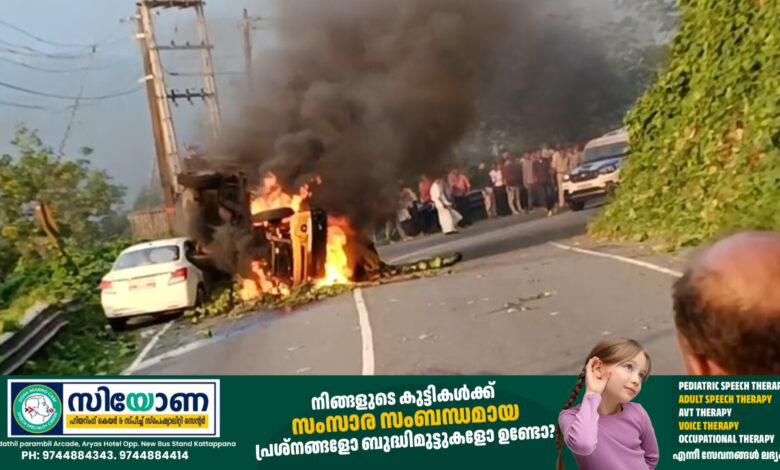 ദേശീയ പാതയില്‍ പിക്കപ് വാൻ കാറിനു മുകളില്‍ ഇടിച്ചു കയറി തീ പിടിച്ചു